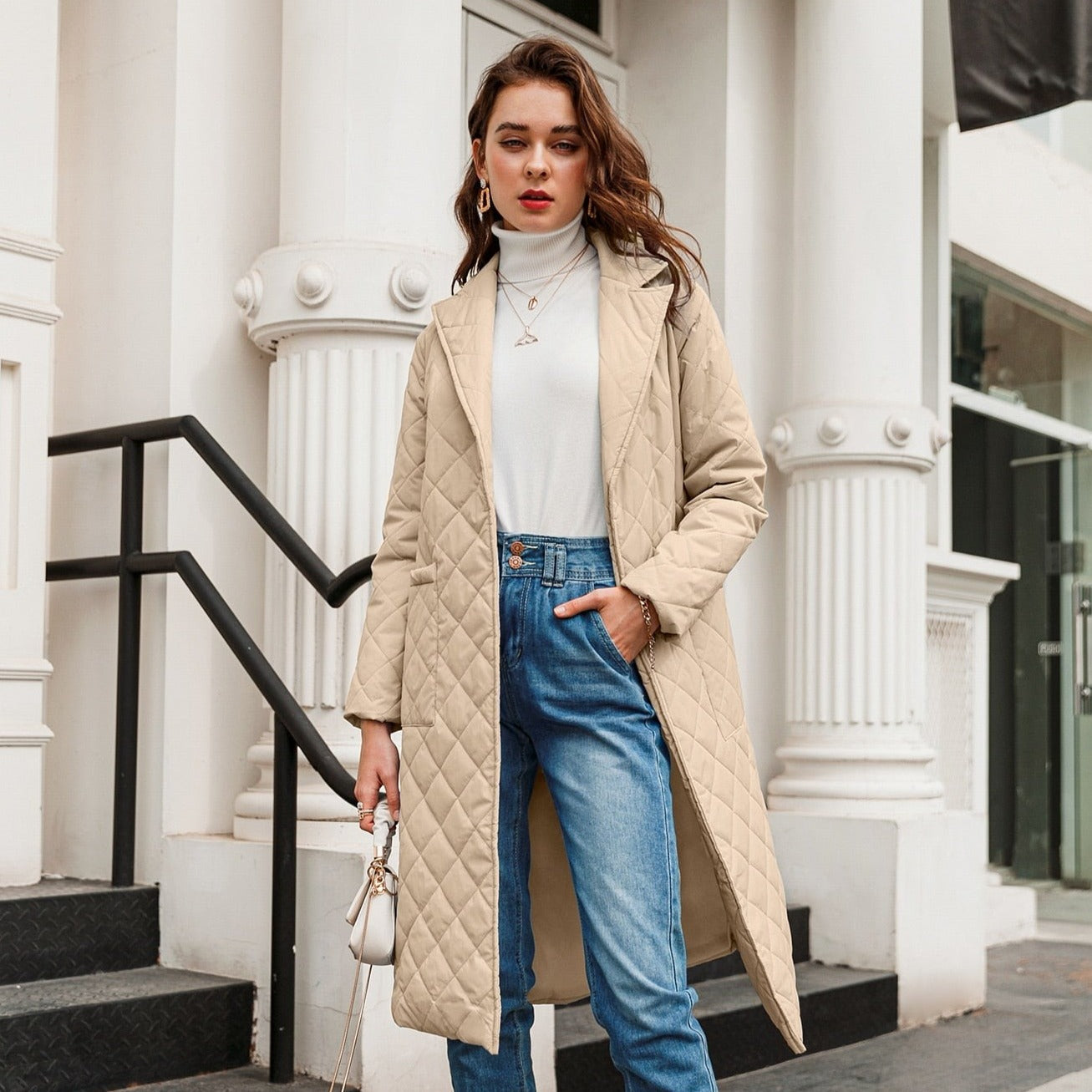 - długi płaszcz zimowy o prostym lub lekko taliowanym kroju – idealny na codzienne stylizacje i zimowe spacery,