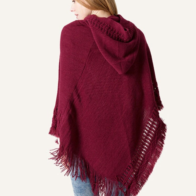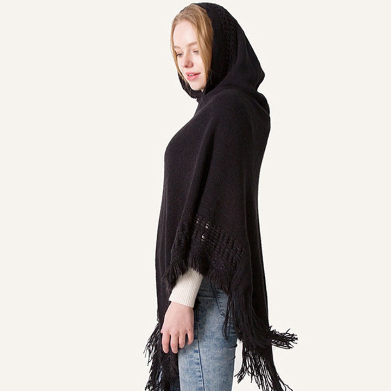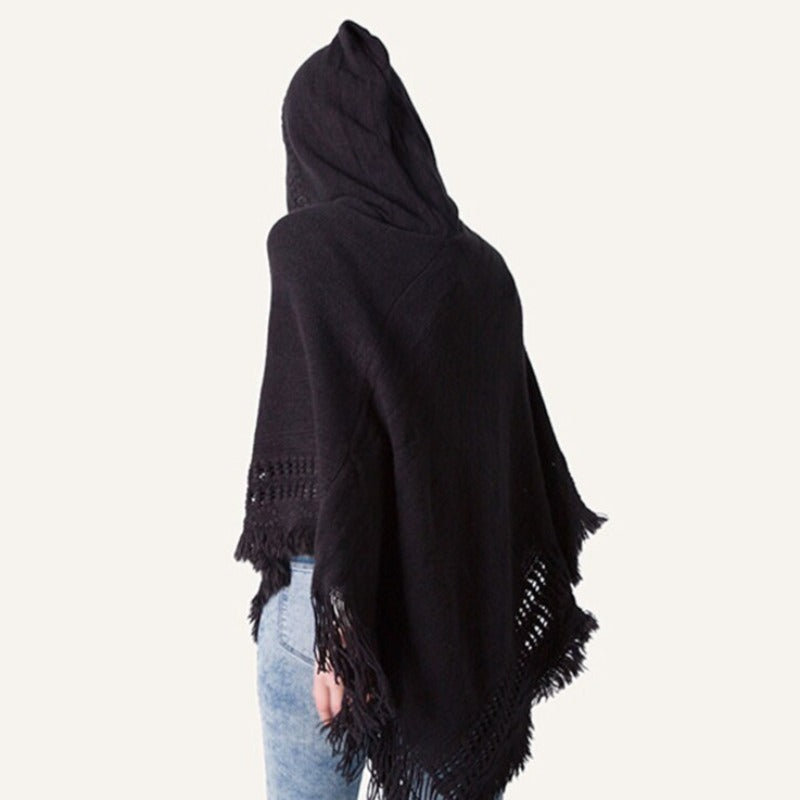 Damski sweter dzianinowy typu ponczo z frędzlami i kapturem