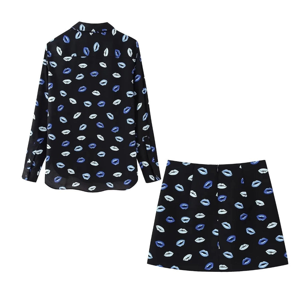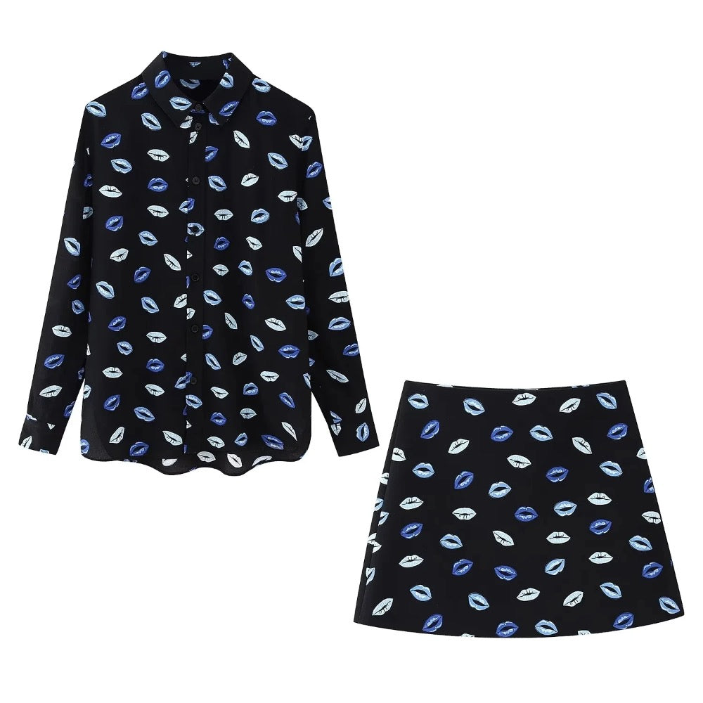 Odkryj wyjątkowy styl z naszym eleganckim kompletem damskim, który zawiera koszulę z długim rękawem zapinaną na guziki oraz spódnicę mini, oba ozdobione motywem ust.