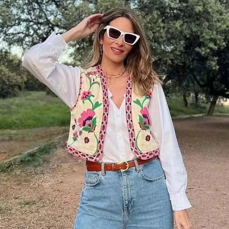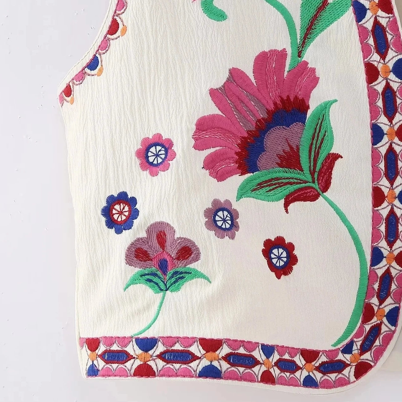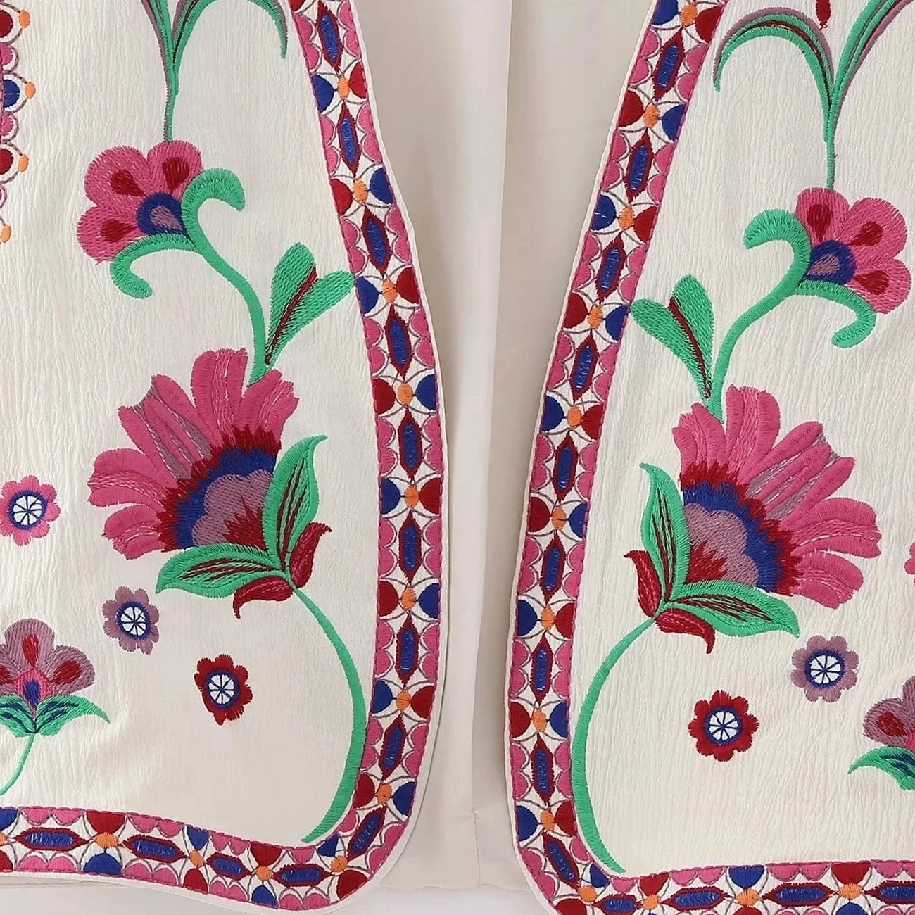 Ta kamizelka damska to połączenie delikatności i elegancji, dzięki wyjątkowemu haftowanemu wzorowi kwiatowemu. Prezentuje subtelny design, który dodaje kobiecego uroku każdej stylizacji. Jest nie tylko wyjątkowa w swoim wzornictwie, ale również zapewnia komfort noszenia, będąc doskonałym wyborem zarówno na specjalne okazje, jak i na bardziej codzienne sytuacje.