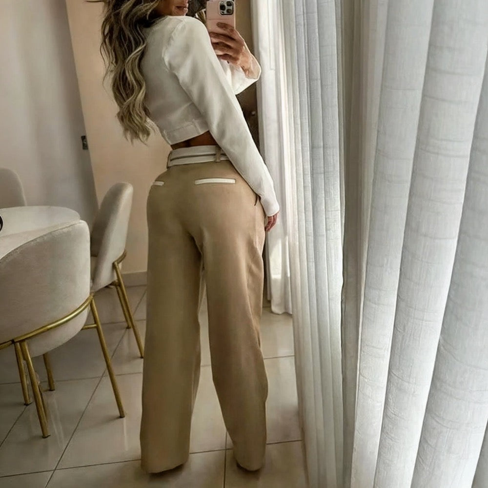 Nasz elegancki dwuczęściowy komplet damski to idealne połączenie stylu i wygody, które sprawi, że poczujesz się pewnie i szykownie w każdej sytuacji. Składa się on z krótkiej marynarki oraz garniturowych spodni o wysokim stanie i rozszerzanych nogawkach.
