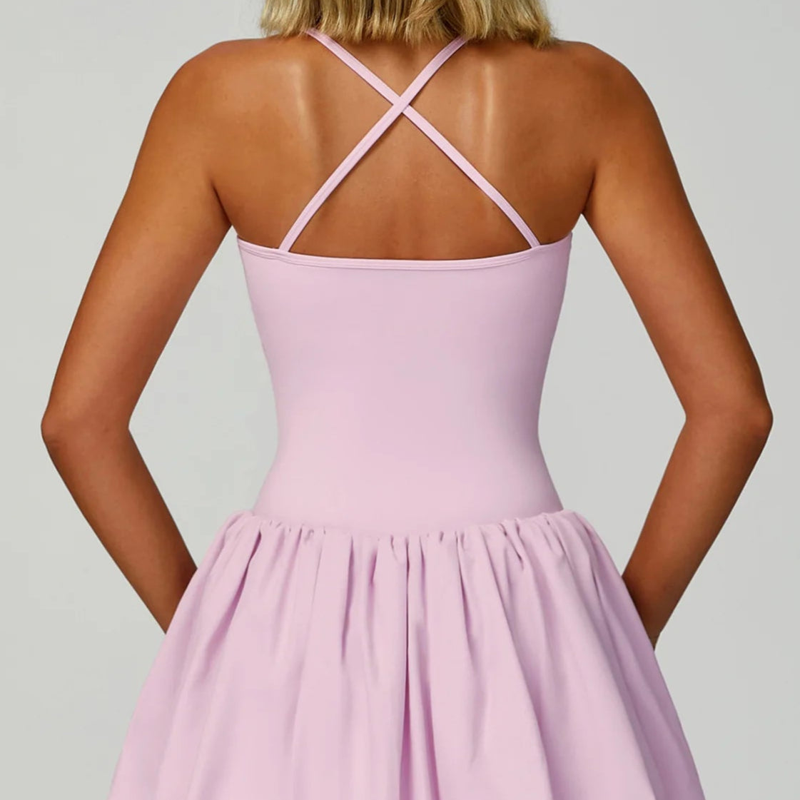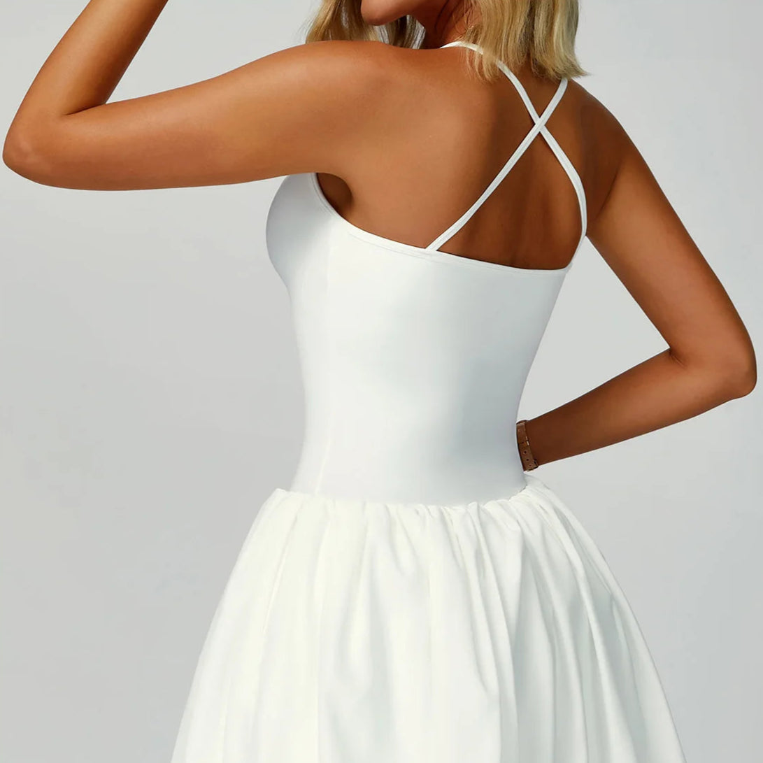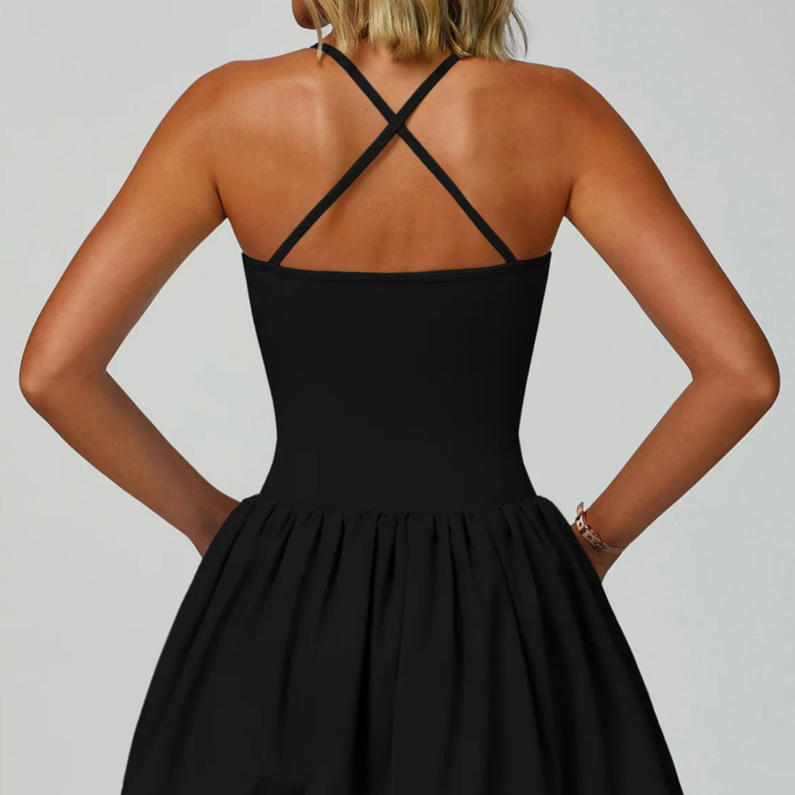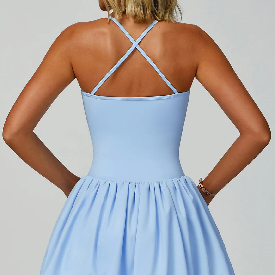 Plecy zdobi efektowny krój z skrzyżowanymi ramiączkami, który nadaje sportowego charakteru i utrzymuje sukienkę na miejscu nawet podczas intensywniejszych aktywności. Wszyte miseczki pozwalają nosić ją bez stanika, a ukryte spodenki gwarantują wygodę i poczucie swobody.