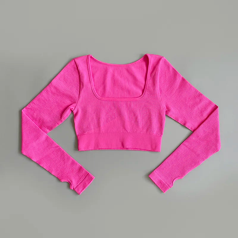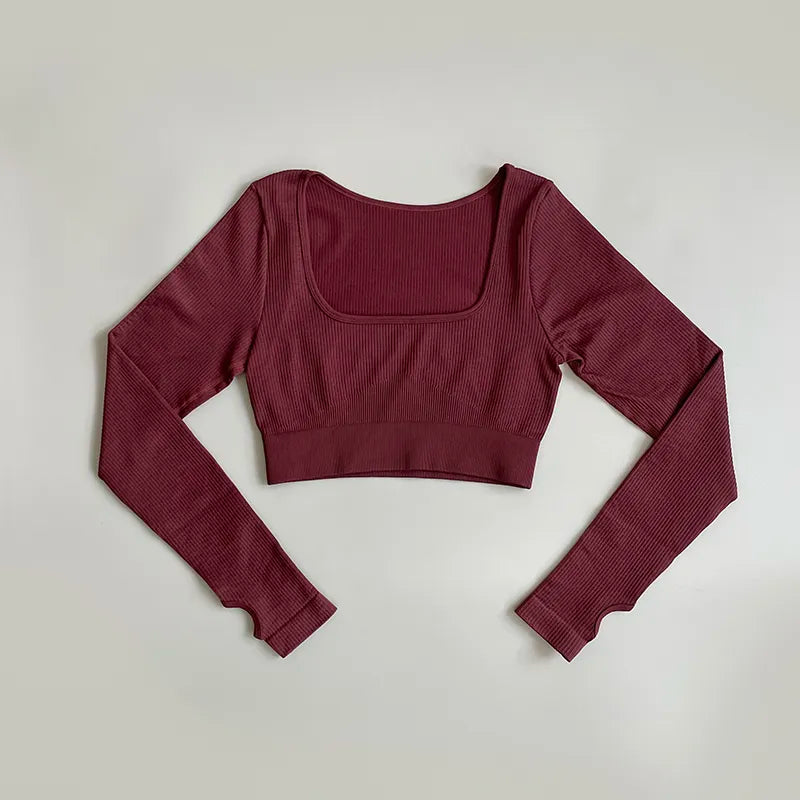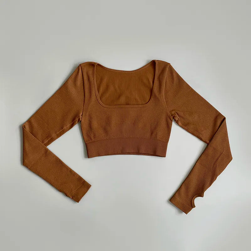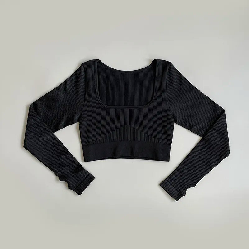 Sportowy top damski prążkowany z długim rękawem i kwadratowym dekoltem